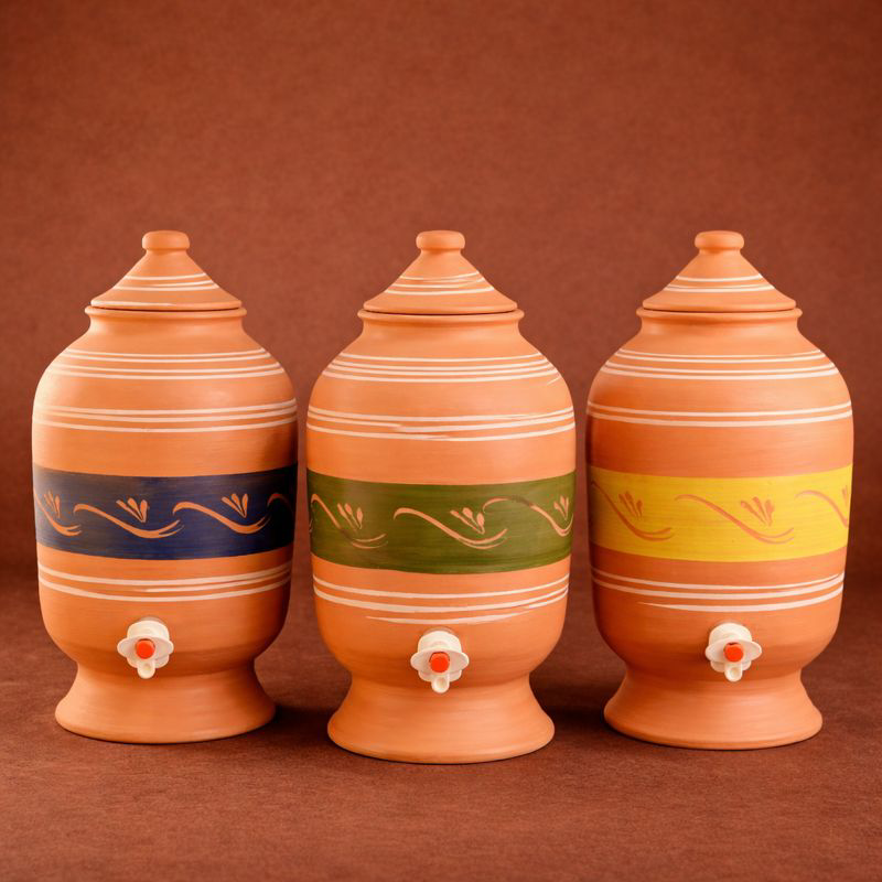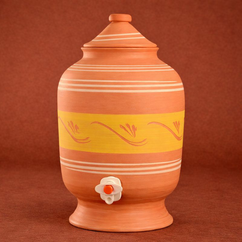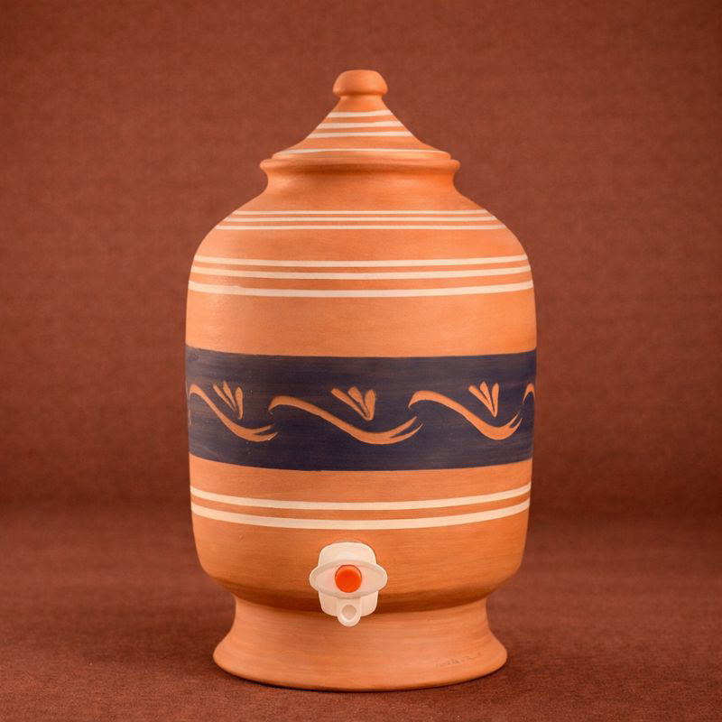 كولمن فخار تيراكوتا بالغطاء منقوش بزخارف يدوية أنيقة وعصرية باللون (الأصفر-الأخضر-الأزرق) حافظ على مياه شربك باردة ومنعشة بشكل طبيعي وصحي دون الحاجة للكهرباء.