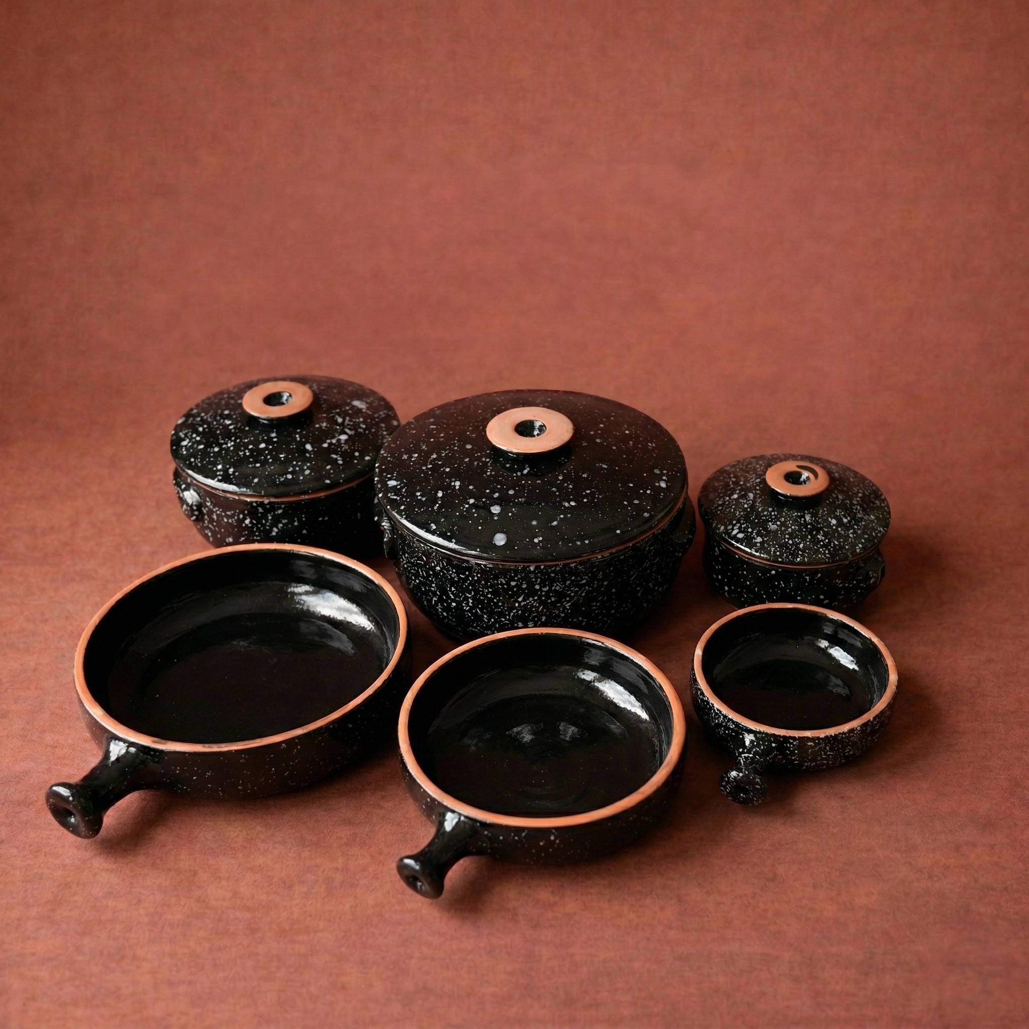 استمتعي بأعلى تكنولوجيا في صناعة الفخار المطور. طقم الحلل والطاسات بطلاء الجرانيت (الجليز) مصمم ليتحمل درجات الحرارة العالية مع ضمان توزيع حراري فائق، مما يجعله مثالياً للطهي البطيء والتحمير المتساوي.