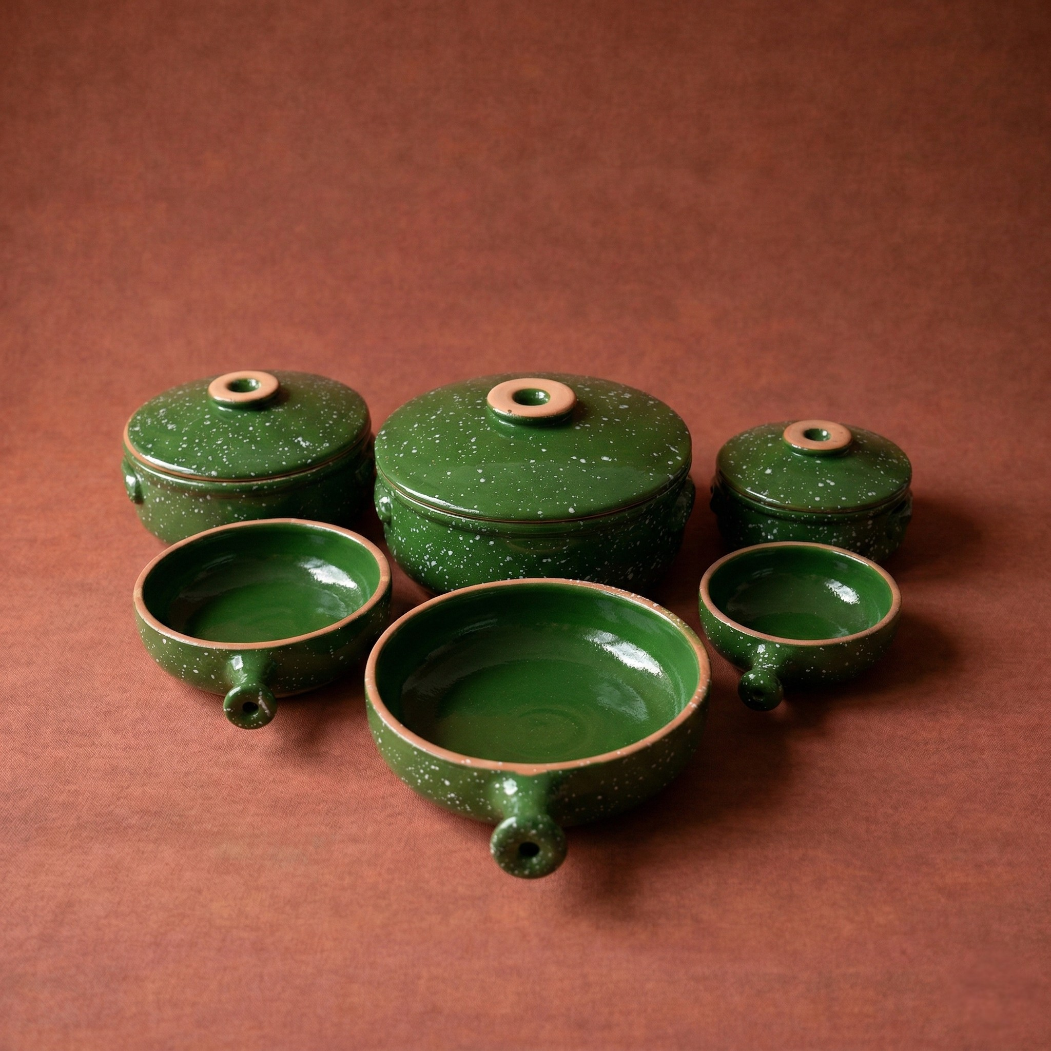 استمتعي بأعلى تكنولوجيا في صناعة الفخار المطور. طقم الحلل والطاسات بطلاء الجرانيت (الجليز) مصمم ليتحمل درجات الحرارة العالية مع ضمان توزيع حراري فائق، مما يجعله مثالياً للطهي البطيء والتحمير المتساوي.