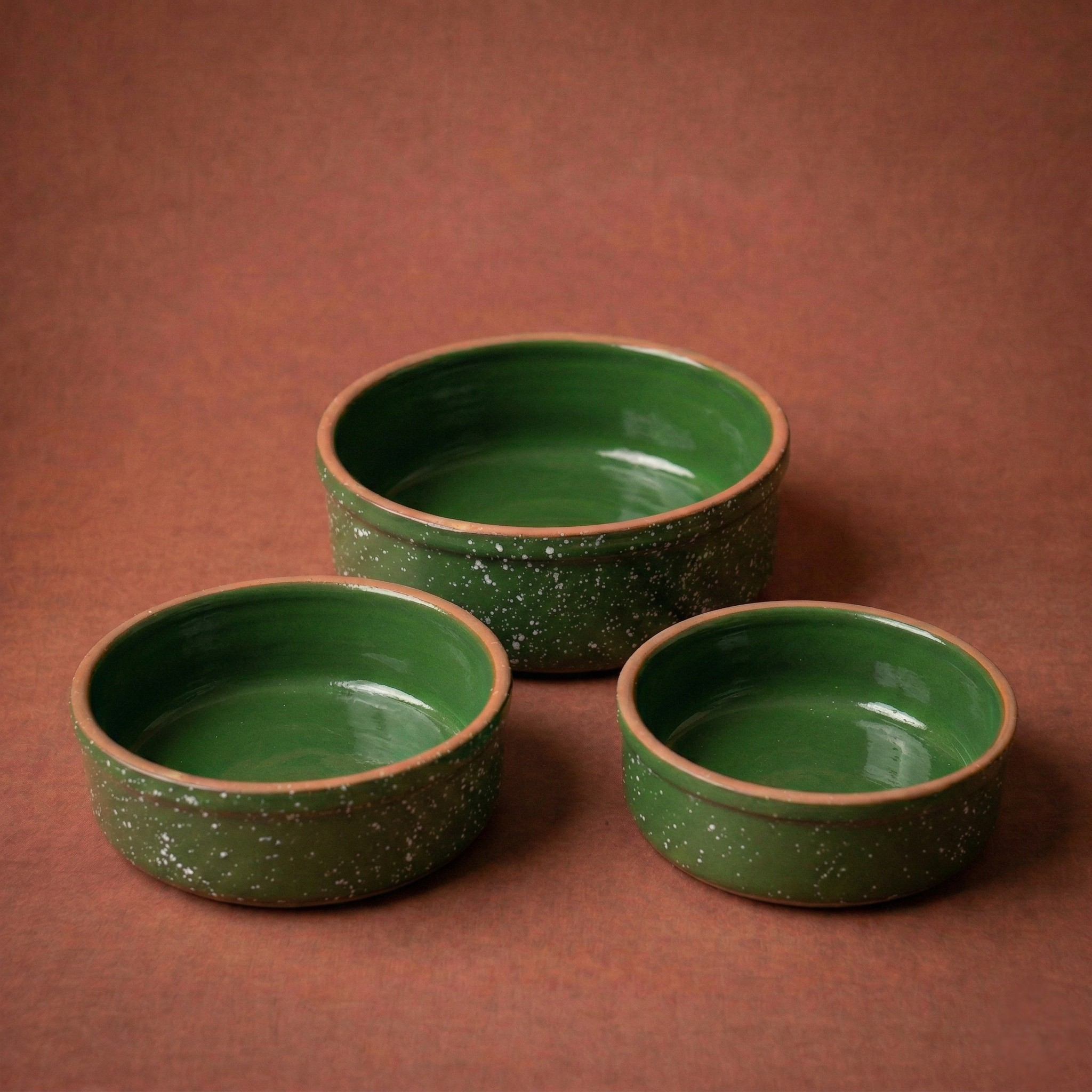 تجربة الطواجن المصرية الأصيلة بلمسة جرانيت حديثة لسهولة التنظيف والاستخدام اليومي. 3 قطع طواجن فخار مطلية بشكل الجرانيت باللون (الأسود-الأخضر-البيج) المنقط